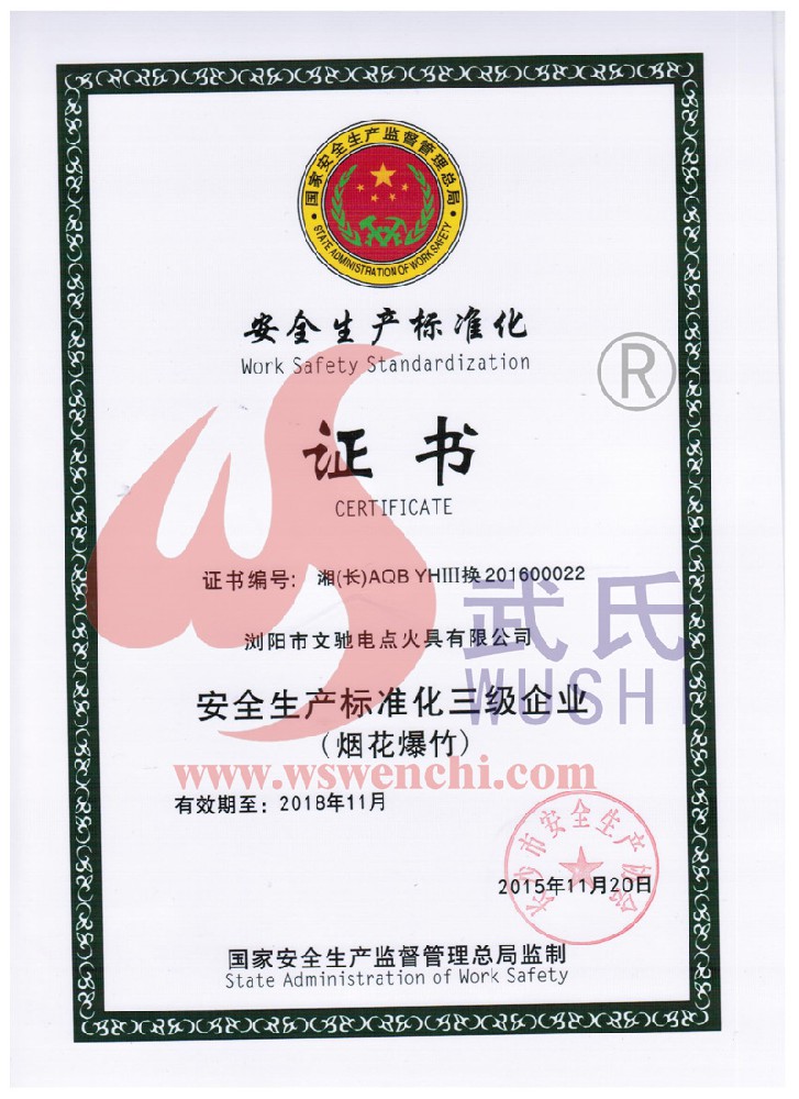 瀏陽市文馳電點火具有限公司(原培文電子點火器材廠),創建于1998年,是一家專業從事研制銷售電子點火產品的民營科技企業,是我國第1枚煙花用電點火頭生產者,是《煙花爆竹電點火頭國標》牽頭起草單位。公司位于中國“煙花之鄉”湖南省瀏陽市,地理位置優越,交通便利。 我公司研制的對象是用電能引燃火藥、做機械功等預定功能的一次性使用的元件或裝置,包括電點火頭(英文名ElectricMatch or Electric Igniter,中文俗稱“電火柴”或“電發火頭”)、電點火管和延期電點火管;我們估且在以后的產品技術欄中將我們研究的產品統稱為電點火具,將電點火器看成是用于提供和控制供給電點火元件點火的電能器材;我們研究的電點火橋路有橋絲式、無橋絲···